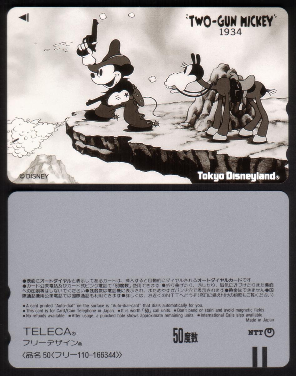 In the foreground, a horse is partially visible, standing next to Mickey, reinforcing the Western theme. The background is minimalistic and devoid of detailed scenery, focusing attention on Mickey and his weapons. The card includes logos and text that identify it with Tokyo Disneyland and Disney, confirming its connection to the official Disney brand in Japan.