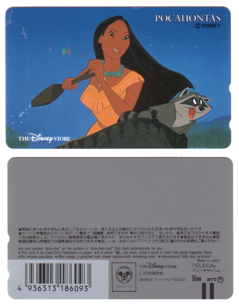 The card includes printed text indicating it is from Disney and was produced in Japan. The card is in mint condition, with no holes present. The colors are vibrant, highlighting the rich greens of the foliage and the reds and browns of Pocahontas’s clothing and the canoe. The Disney Store logo is also visible, linking this item to official Disney merchandise.