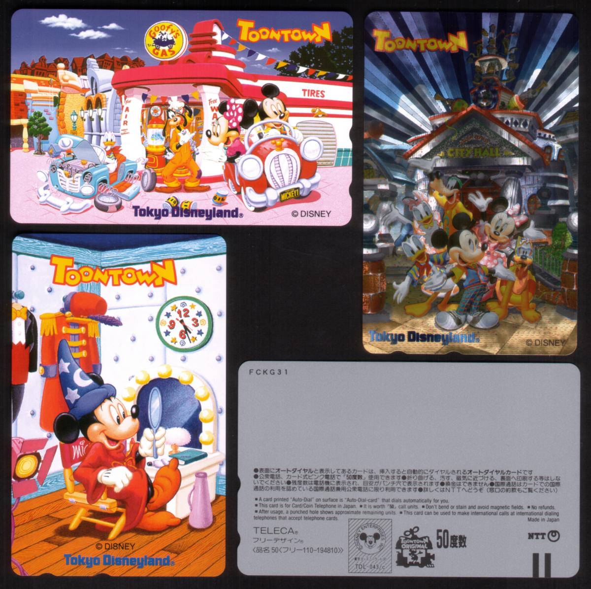 This set of three collectible phone cards features classic Disney characters from ToonTown, produced in Japan. Each card showcases a vibrant illustration of iconic figures including Mickey Mouse as the magician from Fantasia, Minnie Mouse, Goofy, Donald Duck, Daisy Duck, and Pluto. The cards highlight Goofy at his gas station, adding a charming scene to the collection. The artwork vividly captures the playful and whimsical nature of Disney’s ToonTown, with bright colors and detailed character poses.