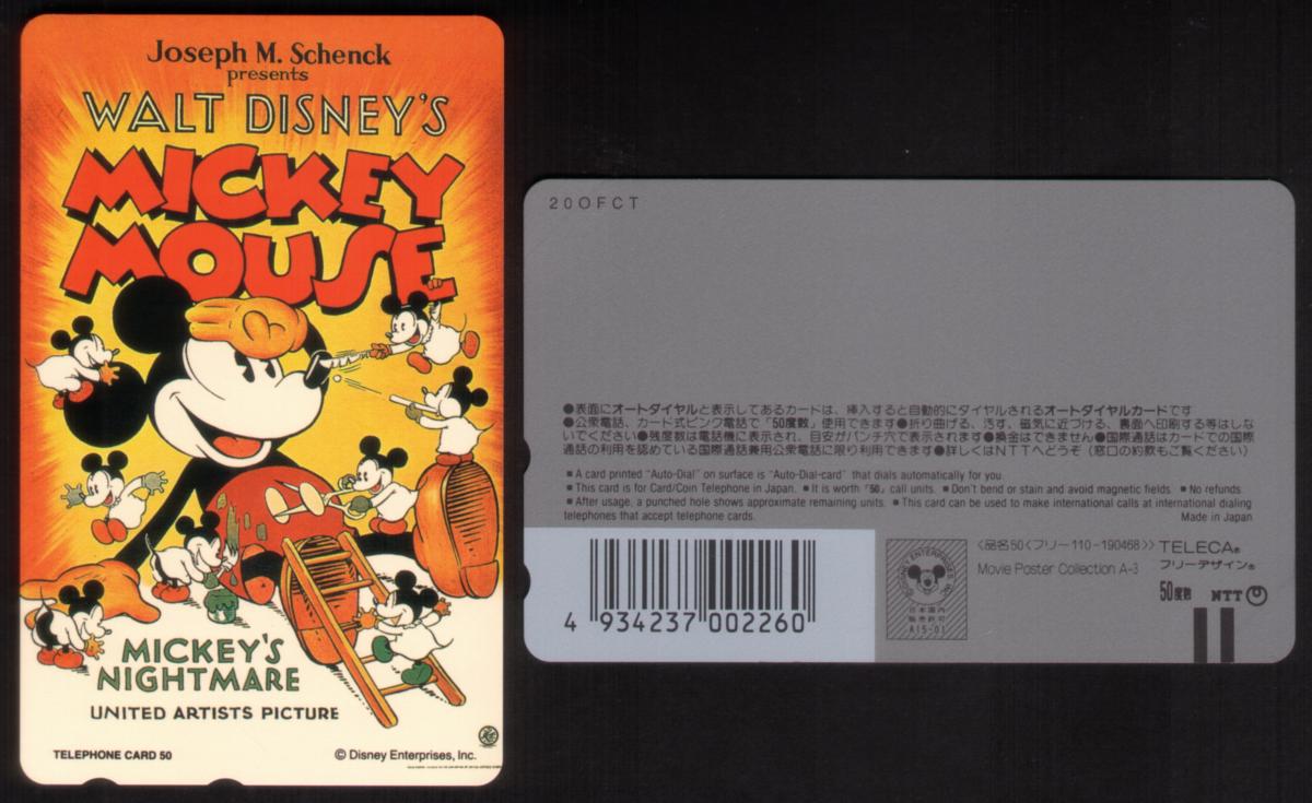This collectible phone card features a colorful illustration of Mickey Mouse from the Disney animated short film "Mickey’s Nightmare." Mickey is depicted asleep in bed, holding a pillow with a worried expression. The background includes typical bedroom elements such as a green headboard, a side table with a lamp, and a window showing a dark night sky. The card presents a bright, cartoon-style design consistent with classic Disney animation.