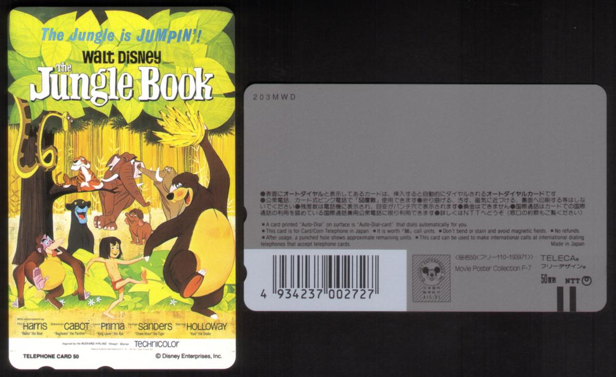 Text on the card includes "Disney Mickey Mouse The Jungle Book Movie" and the number "193971" printed prominently. The card is marked as "MINT" condition with no holes punched. It originates from Japan and is part of the Movie Poster Collection F-7 series. The card integrates a cohesive Disney branding along with references that confirm its authenticity and collectible nature related to both Mickey Mouse and The Jungle Book.