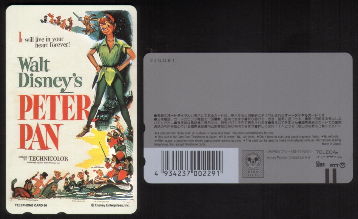 This card belongs to a series of collectible phone cards issued in Japan, celebrating Disney movies. The artwork retains strong visual connections to the original movie, showcasing Peter Pan’s iconic green outfit and youthful appearance as he flies confidently above the cityscape. The card is an official licensed collectible, reflecting the high-quality production standards typical of Disney merchandise from Japan.