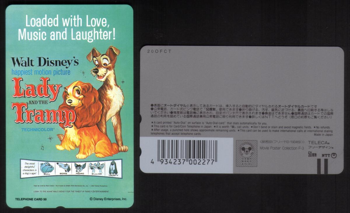This collectible phone card from Japan features artwork from Disney's animated movie *Lady and the Tramp*. The card showcases the classic Disney title "Lady and the Tramp" prominently displayed in elegant, stylized font at the top. The central image includes the two main characters, Lady and Tramp, depicted in a charming and recognizable manner consistent with the film’s original animation style. Lady, the refined Cocker Spaniel, and Tramp, the scrappy street dog, are both visible, highlighting their distinct looks and personalities.