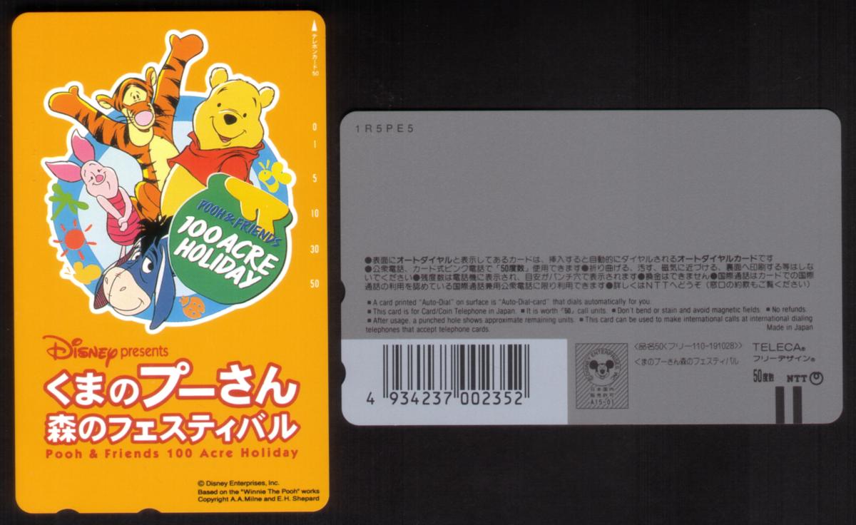 The text on the card includes "Disney Winnie The Pooh & Pals 100 Acre Holiday" along with "Japan," indicating its country of origin. The card is dated "191028," which is likely a production or issue code. The card is in mint condition with no holes punched or damage. The Disney logo is present, confirming its official licensing.