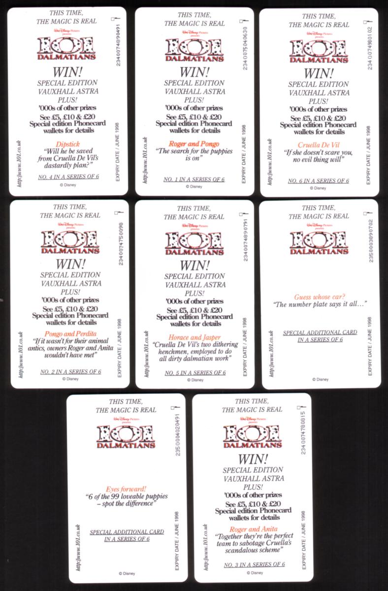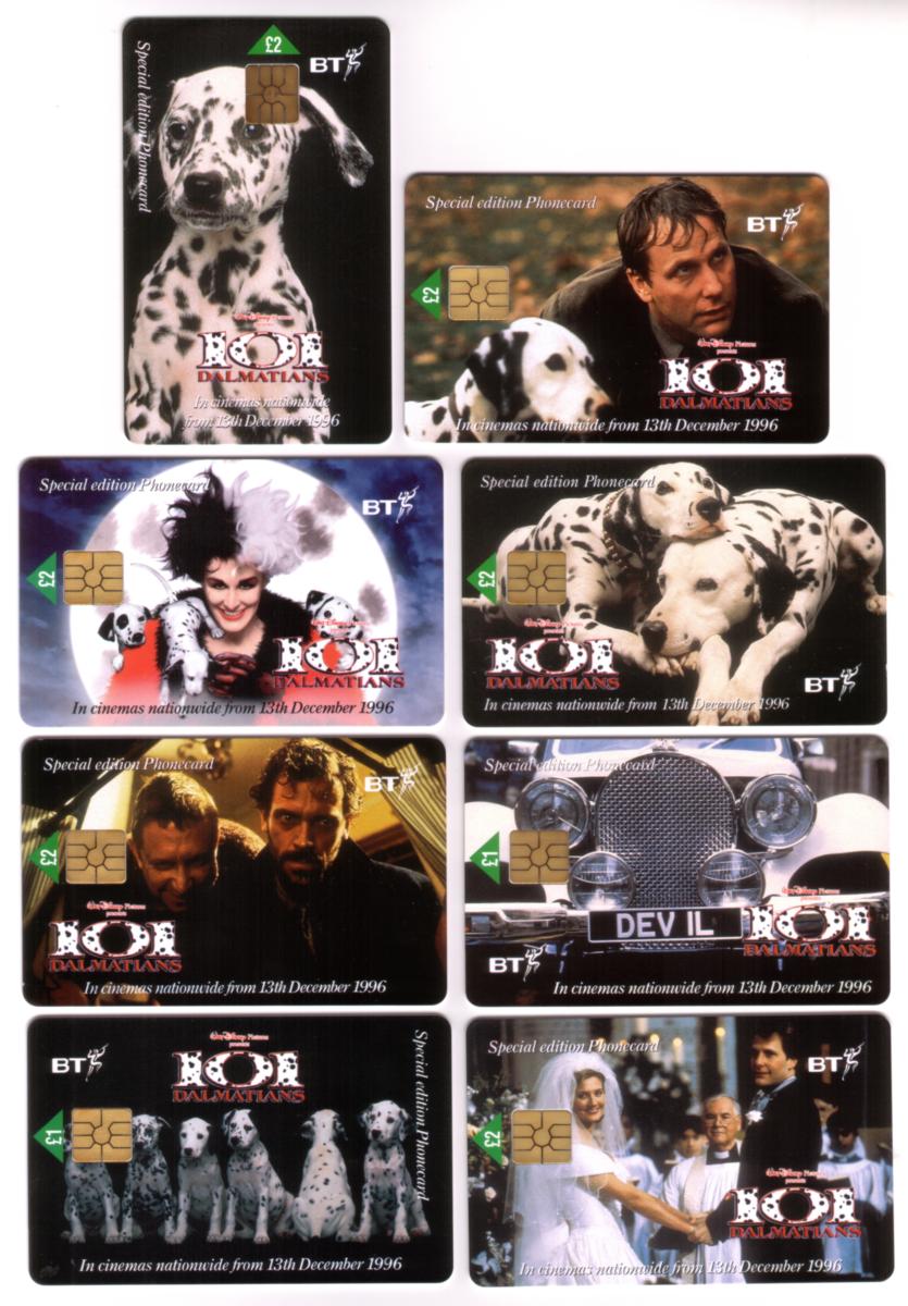 A nostalgic set of eight 1990s UK promotional cards featuring Dalmatian puppies, Cruella de Vil, Roger, and Anita from Disney''s live-action 101 Dalmatians film. |