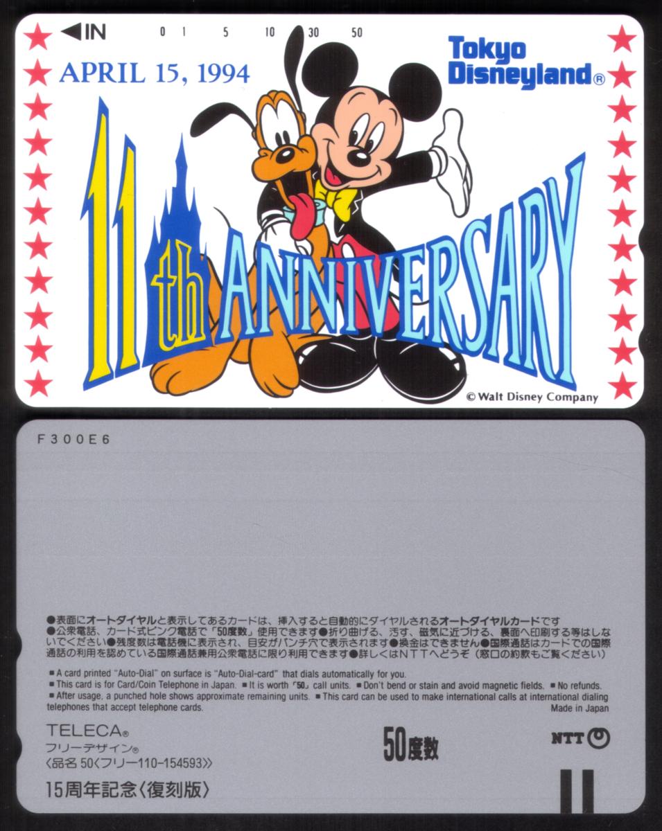 The card includes the text "11th Anniv Tokyo Disneyland" indicating the celebration of the park’s 11th anniversary. The Disney and Japan references confirm it is an official Japanese collectible item. The artwork is colorful and vibrant, set on a plain background that emphasizes the characters and the anniversary text. This phone card was issued in Japan, adding to its collectible appeal for Disney fans and phone card collectors alike.