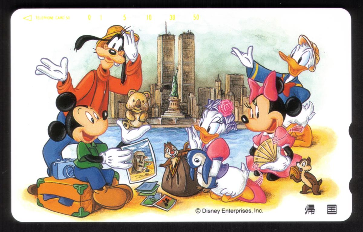 This collectible phone card from Japan features iconic Disney characters Mickey Mouse, Goofy, Donald Duck, Daisy Duck, Minnie Mouse, Chip, and Dale set against a New York City background. The Twin Towers of the World Trade Center stand prominently in the center with the Statue of Liberty visible nearby. The setting evokes Americana and captures a famous snapshot of New York’s skyline with clear skies.