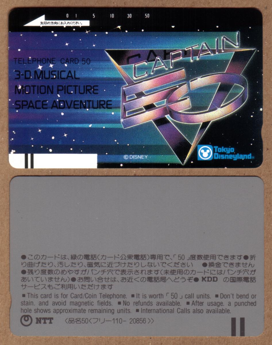 This phone card was produced in Japan, as indicated by the text on the card. The artwork and logos are printed in bright colors with high detail, capturing the essence of the 3-D action and music-packed theme of Captain EO. The card is a collectible item for fans of Disney, Michael Jackson, and space adventure-themed media.