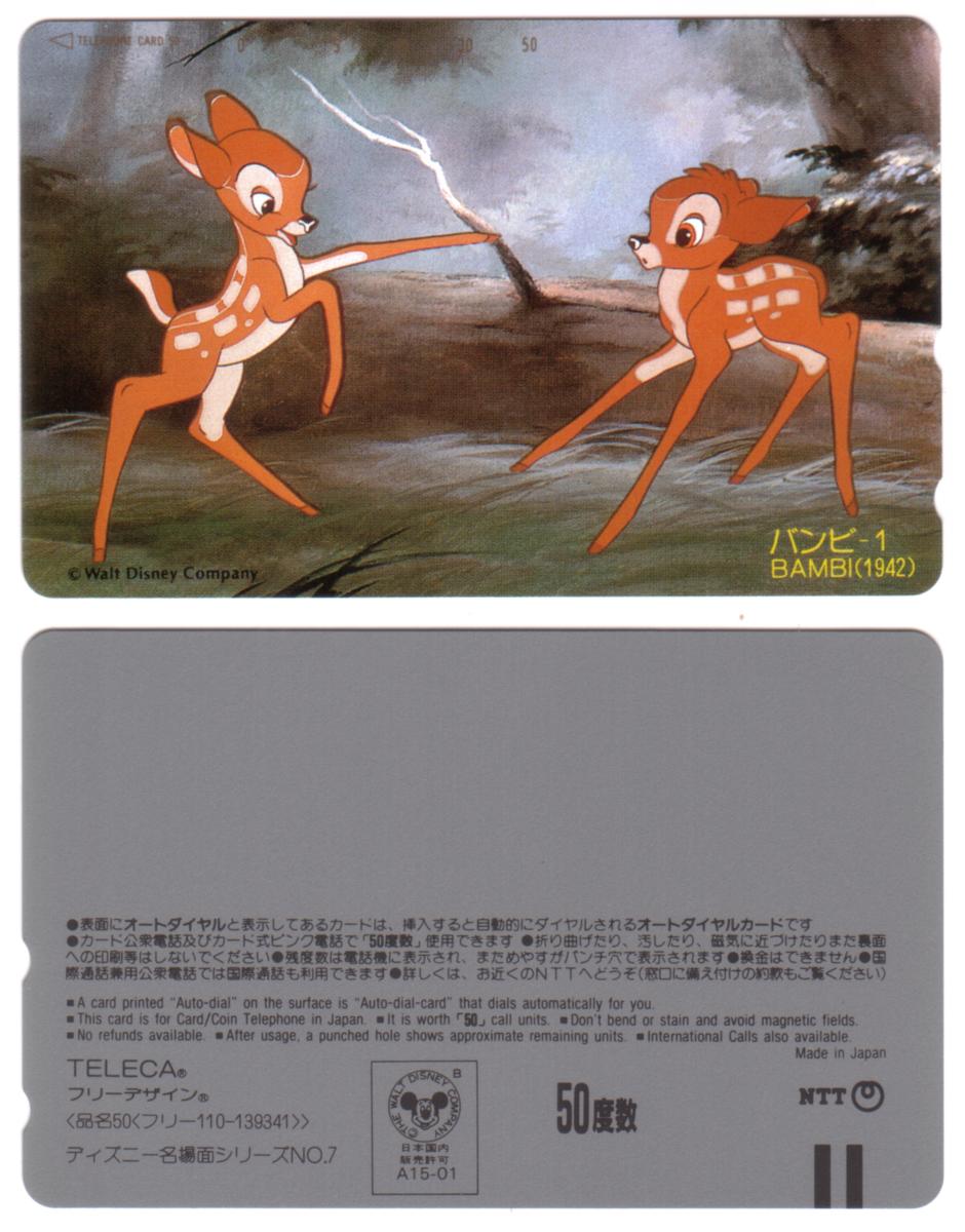 The card is identified as a collectible Disney item and holds appeal for fans of classic Disney animation. It measures approximately the size of a standard collectible phone card, consistent with Japanese collectible card formats. The design highlights the timeless character of Bambi and the enchanting forest setting from the film.