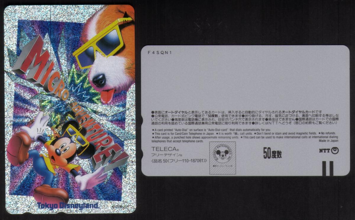 This collectible mint phone card features Disney’s iconic character Mickey Mouse in a detailed and colorful design from Japan. Mickey is depicted in an adventurous pose, part of the "Micro Adventure" series, which is indicated on the card with the number 187061. The card includes the phrase "You'll be shrunk," referencing the theme of the Micro Adventure series. The design places Mickey in a dynamic, animated style consistent with classic Disney art, capturing his cheerful and spirited personality.