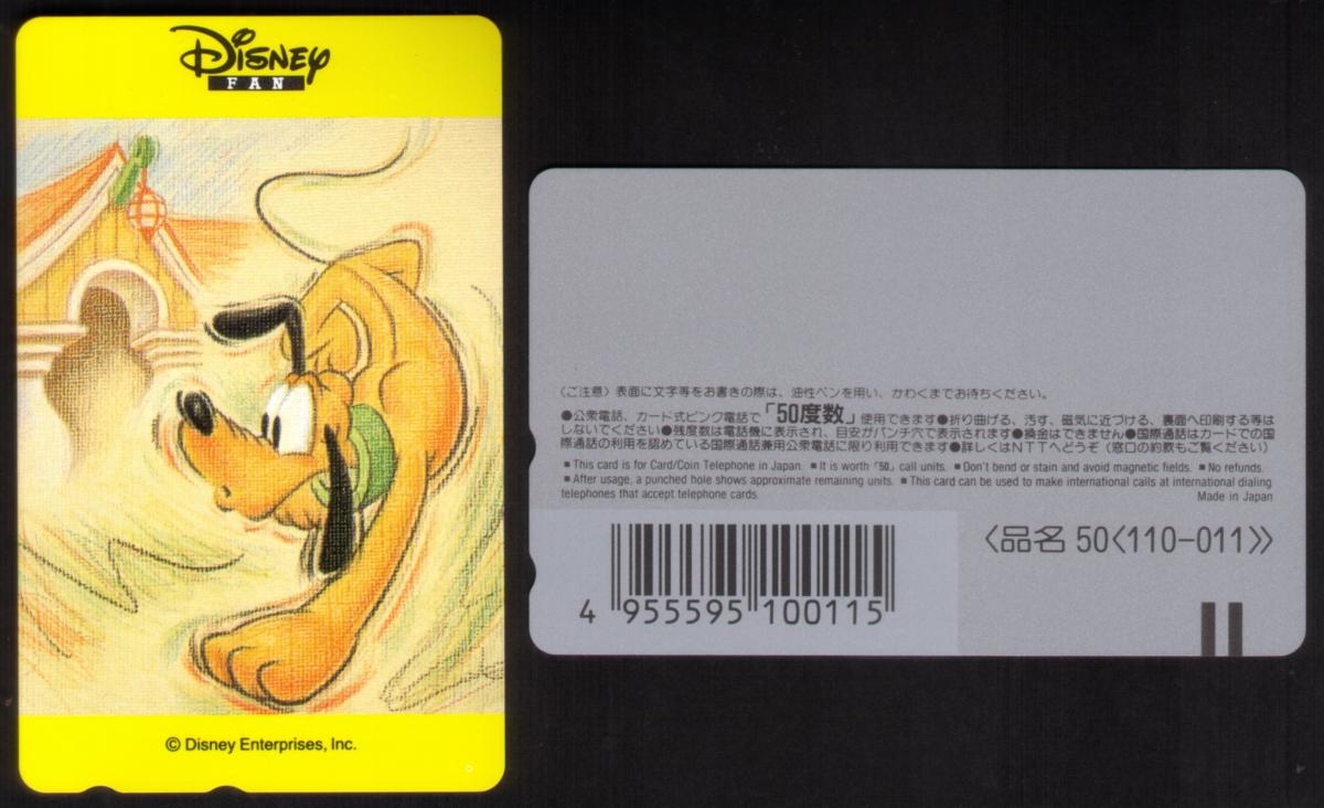 The card includes text on the right side, reading "110-011," which is part of the identification numbering. The word "Disney" is printed above the number, confirming the official Disney branding. The overall style is clean and simple, capturing the playful and friendly nature of Pluto, a classic Disney character. The card originates from Japan, reflecting its place of issue.