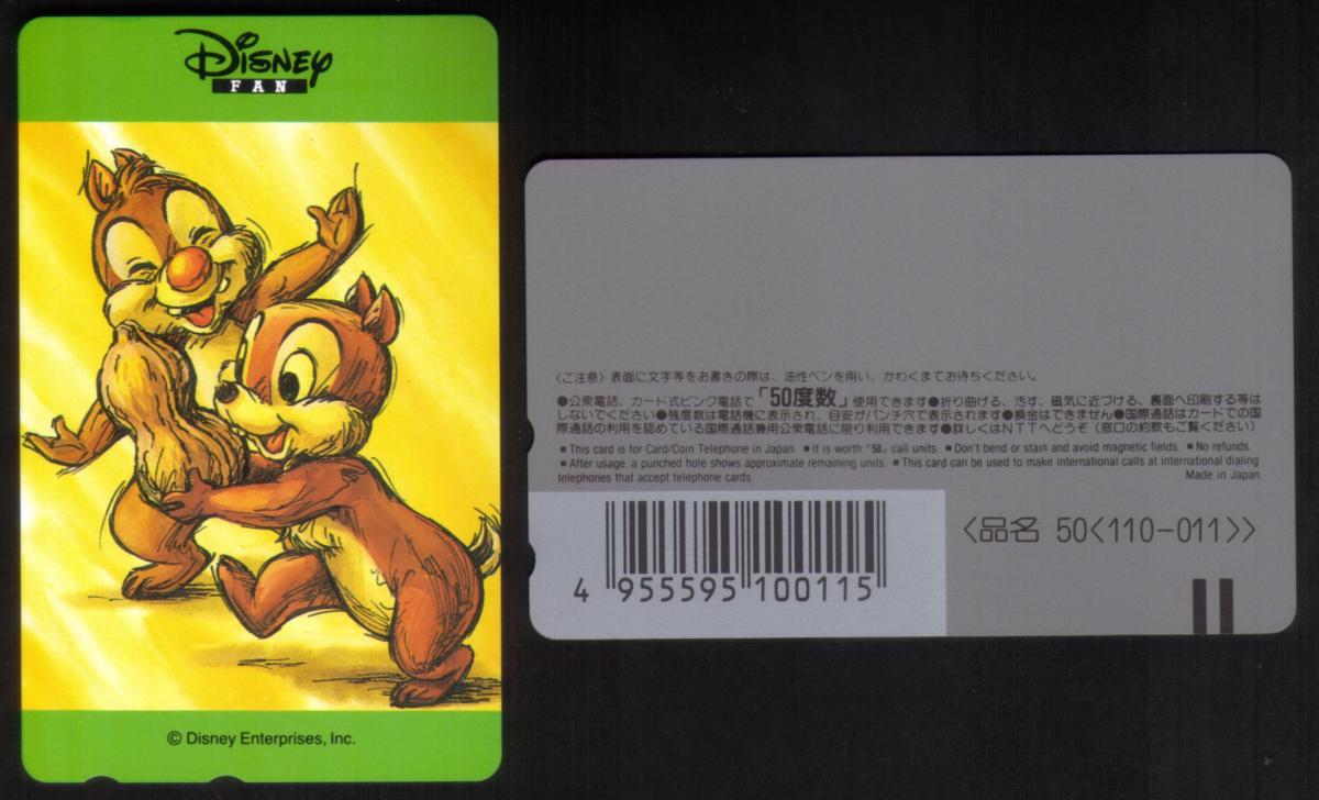 The artwork is colorful and vibrant, capturing the friendly, animated style typical of Disney merchandise. The card is in mint condition without any holes, preserving its collectible value. This is a collectible phone card issued in Japan featuring Chip and Dale from Disney.