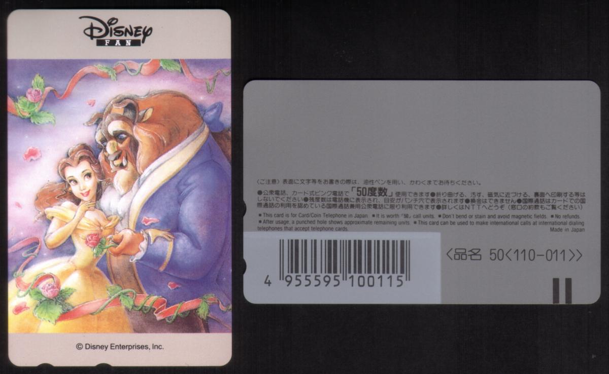 At the top left corner, the Disney logo is visible, along with text indicating the card’s origin as Japan. The card includes fine detailing such as the shimmering effect on the background, adding to its collectible appeal. The name “Beauty and the Beast” is printed in elegant script alongside the Disney branding, emphasizing the card’s connection to the famous animated movie.