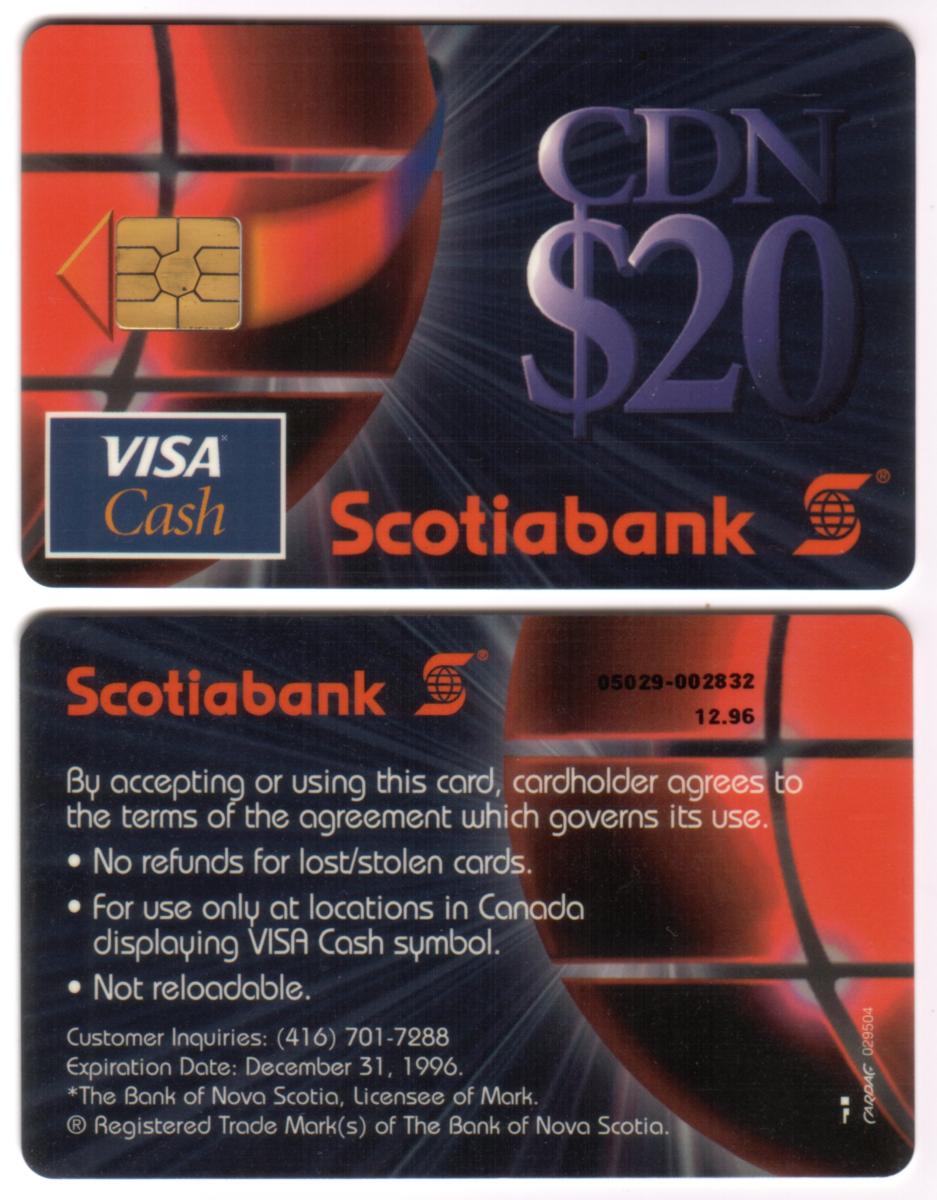This collectible chip card is a Visa Cash Card issued by Scotiabank in Canada, featuring a stored value of $20. The front of the card prominently displays the Visa Cash logo alongside the Scotiabank name and logo. The design emphasizes its function as a smart card with an embedded chip, intended for cash transactions. The card’s layout aligns with standard bank card formats from the mid-1990s, highlighting its use as a prepaid stored value card.