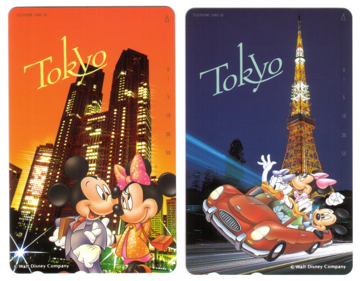 The cards feature the Tokyo location prominently, connecting them to the Tokyo Disney theme. The cards include Japanese text along with the numbers, confirming their origin. The design includes playful, engaging backgrounds that complement the characters, emphasizing a joyful Disney atmosphere made for collectors.
