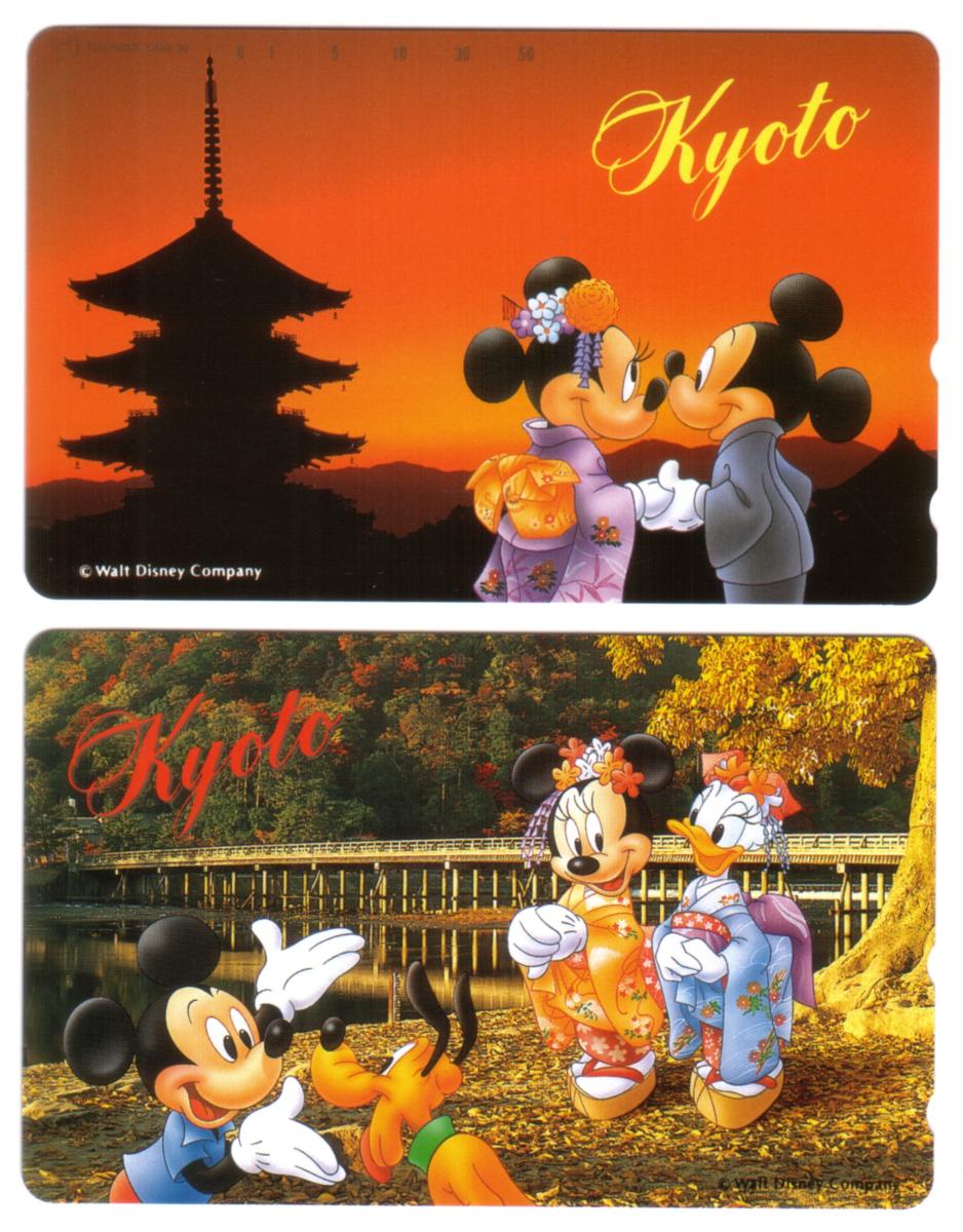 This collectible phone card set features two cards from Japan, each mint condition with no holes. The cards showcase iconic Disney characters Pluto and Daisy Duck alongside Mickey Mouse and Minnie Mouse. The artwork references Kyoto, Japan, likely highlighting a cultural connection or theme associated with the location. The cards display the catalog numbers #171012 and #171013, which correspond to the two separate cards in this set.