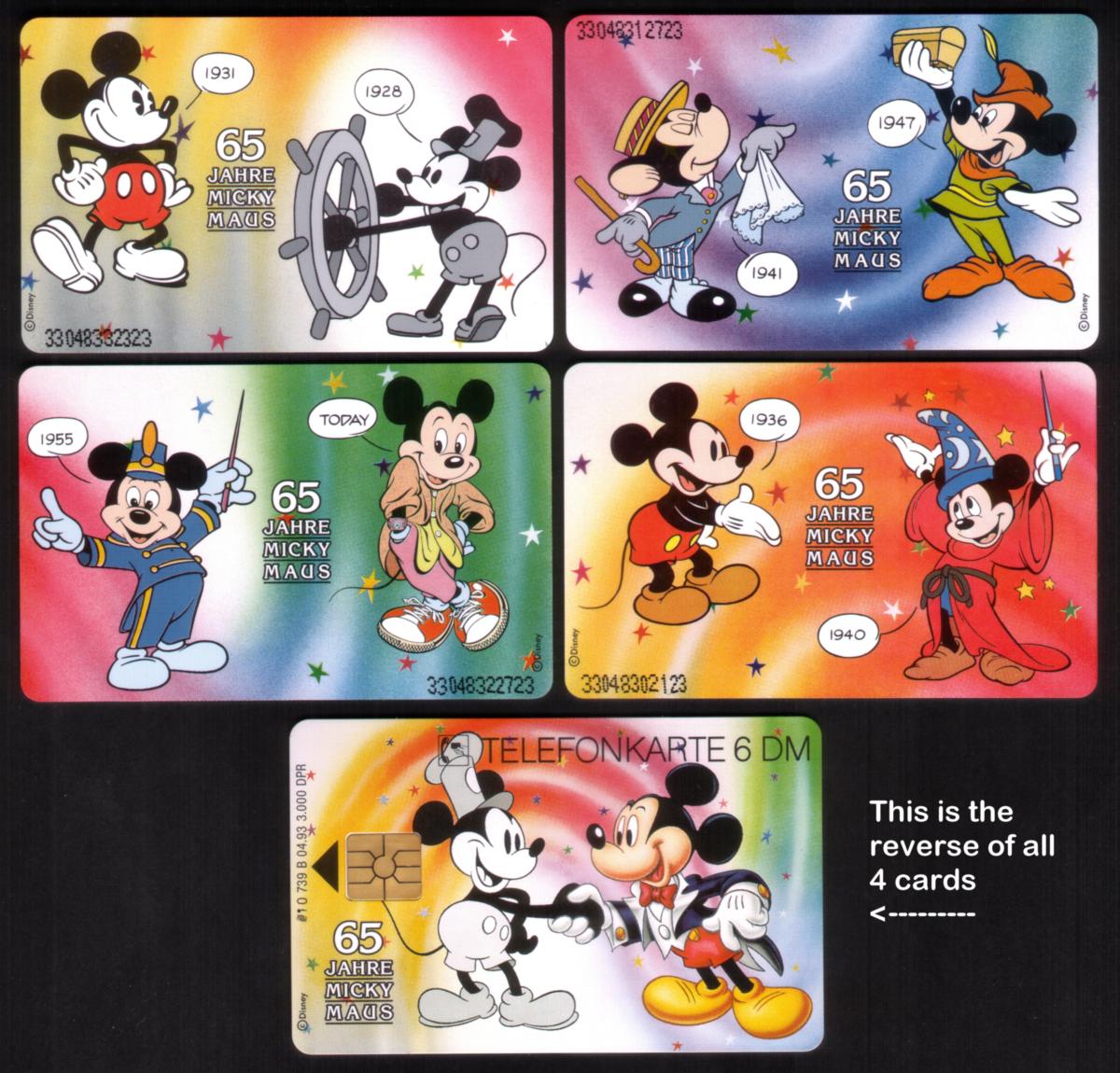 This collectible chip card from Germany features artwork related to the 65 Years of Mickey Mouse celebration, issued in 1993. The card prominently displays Steamboat Willie, the iconic character from Disney’s classic 1928 animated short film. The design captures the vintage black-and-white aesthetic of the original cartoon, highlighting Mickey Mouse in his early animation style.