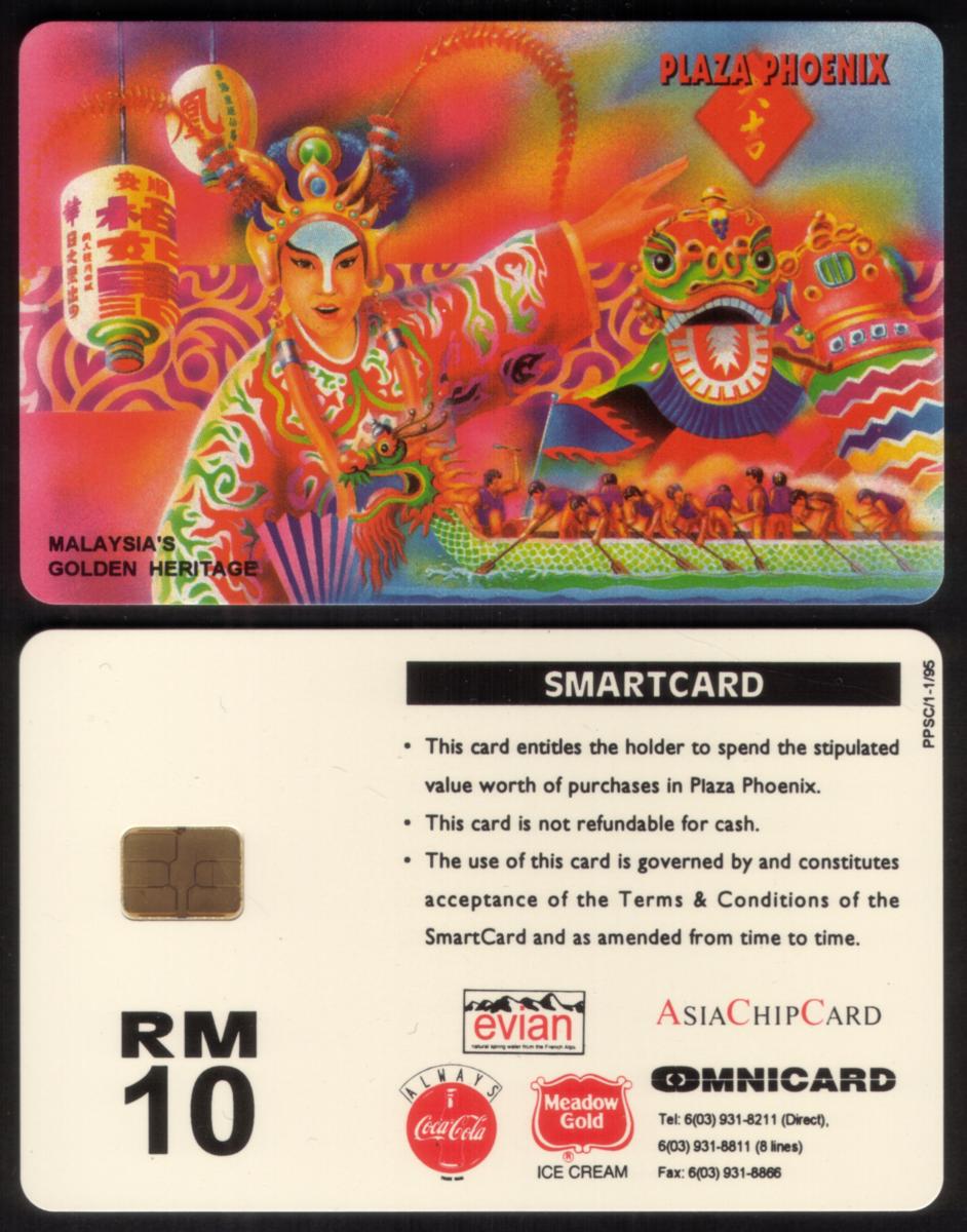 Other identifying features on the card include the “svc” abbreviation, reinforcing its function as a stored value card, and a subtle globe image behind Plaza Phoenix, suggesting international connectivity. The combination of logos, value, location name, and branding makes this a distinctive collectible chip card centered around Malaysian heritage and Coca-Cola’s promotional imagery from the mid-1990s.