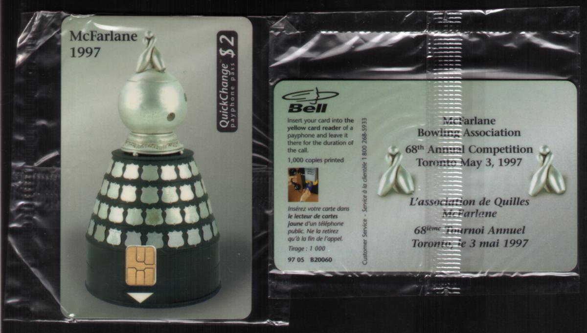 This card is associated with sports collectibles and functions as a multi-use sports-related stored value card issued in Canada. The combination of McFarlane Bowling Association branding, the year 1997, and Canada Bell’s QuickChange service firmly establish its context within sports and telecommunications stored value cards.