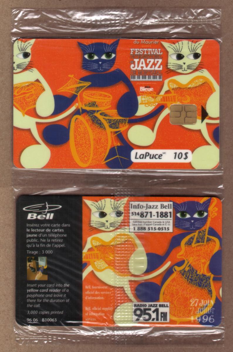 Overall, the card is a well-preserved, sealed collectible item that commemorates the Montreal International Jazz Music Festival held in 1996. It represents a specialized form of stored value technology linked directly to the Canadian telecommunications system, showcasing the intersection of culture and technology during this period. The card’s visual and textual content directly associates it with Montreal, Canada, and the music festival itself.