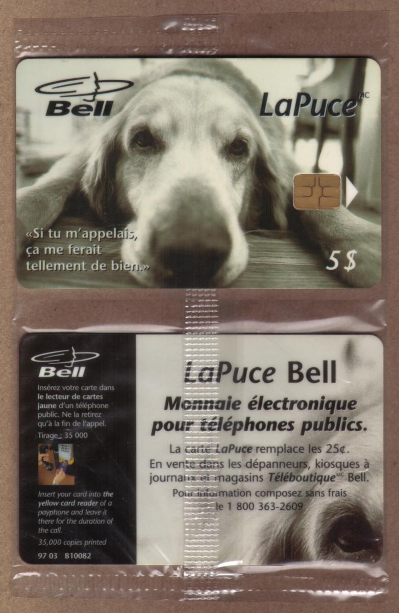 This collectible chip card is a Canadian stored value phone card issued in 1997 by Bell, featuring a design related to the "Sad Dog Electronic Money For Public Telephones" series. The card has a $5 stored value and is part of the Monnaie Electronique pour Téléphones Publics program in Canada. The front of the card includes text in both English and French indicating its function as a stored value card for public telephones, along with the phrase "If you called me it would do me so much good." The card also displays the Bell logo and references "LaPuce," which relates to Bell’s chip card technology.