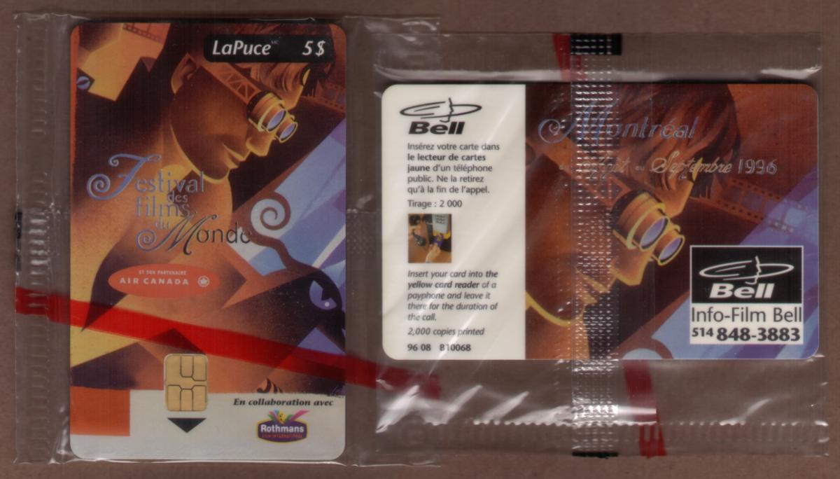 This collectible chip card is a stored value smart card issued in Canada, associated with Air Canada and Rothmans. It features the text "Montreal Film Festival 1996" prominently displayed, indicating it commemorates that specific event. The card uses Bell Canada’s La Puce technology and carries a $5 stored value. The design includes branding for Air Canada, with the airline’s recognizable logo, as well as Rothmans, a known tobacco company.