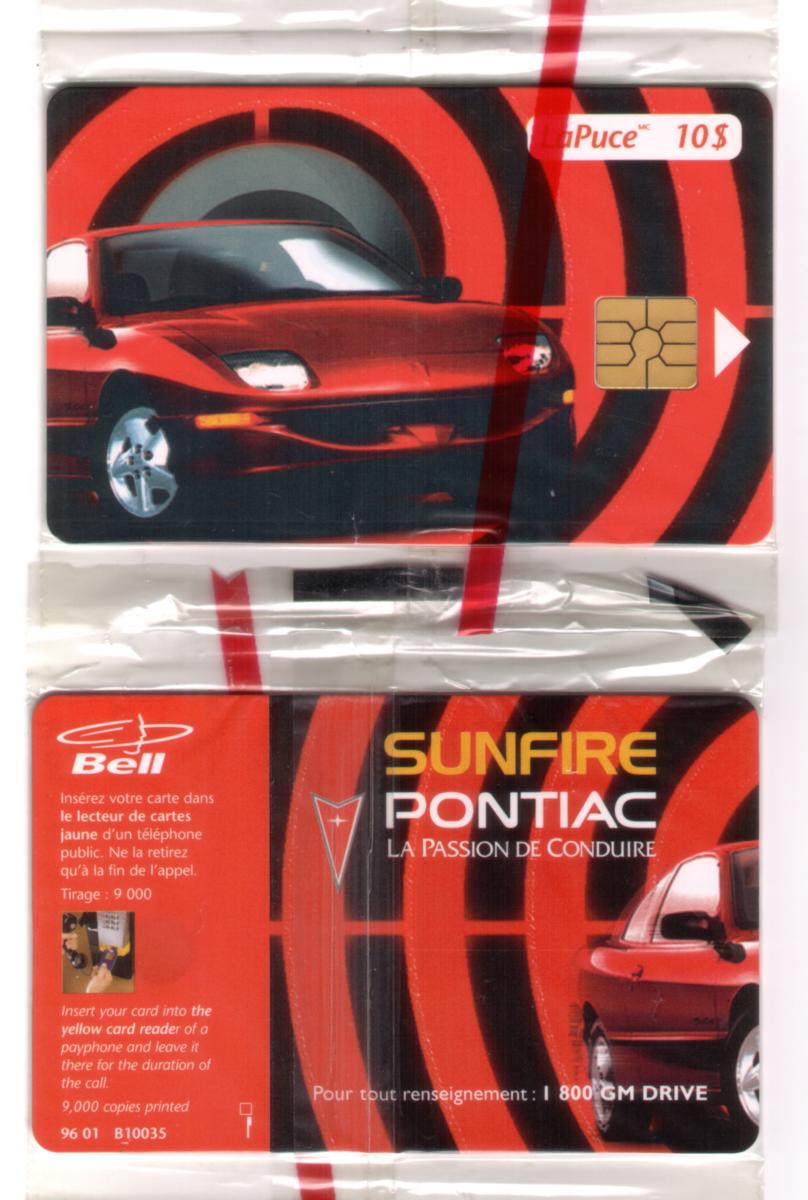 The card is a chip smart card, manufactured by Bell LaPuce in Canada. The label includes the text “B10035 $10” indicating its value and type as a stored value card, which can be used for service purposes. The photograph of the car is crisp and clear, highlighting the front and side profile of the Pontiac Sunfire, a well-known automobile model.