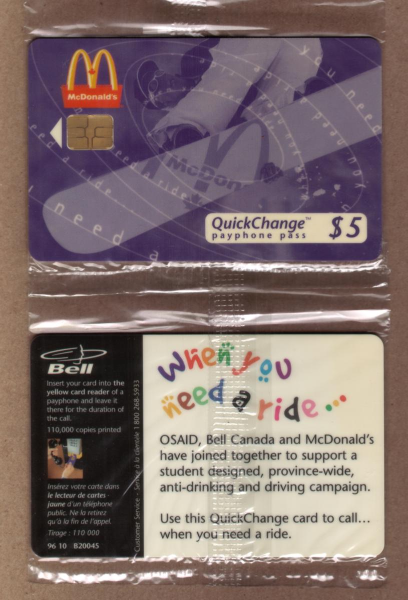 This collectible stored value card features branding from McDonald's with the promotional message "When You Need A Ride Anti-Drinking & Driving." The card is issued in Canada and is affiliated with Bell QuickChange, indicated prominently on the card. The value of the smart card is $5. The design includes the Bell logo and the McDonald's name, emphasizing its partnership in promoting safe choices related to transportation and alcohol consumption.