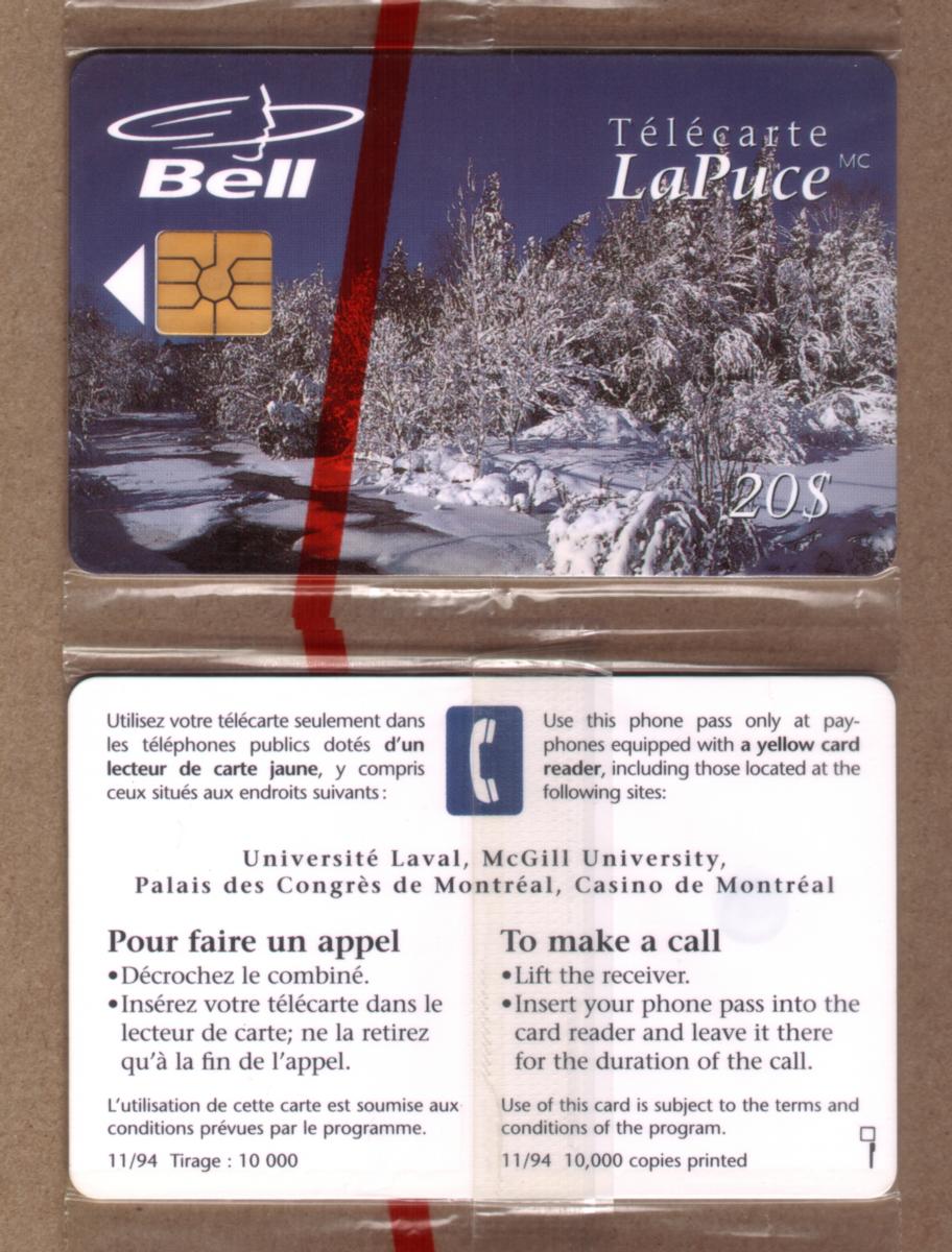 This collectible chip card is a Canadian stored value card issued by Bell LaPuce in 1994. The card has a value of $20 and features a scenic winter landscape with trees covered in snow, reflecting a tranquil and cold winter day. The image captures the natural beauty of a snow-laden forest setting, highlighting the contrast between the dark tree trunks and the bright white snow under clear lighting.