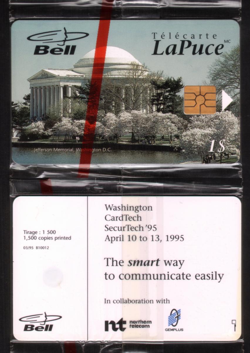 The card is issued by Canada, associated with Northern Telecom and Gemplus. It is a stored value chip card designed for use as a smart card. The denomination displayed is B10012 $1. The card also features the text "CardTech SecurTech Washington DC Jefferson Mem. Show Card SEALED!" clearly printed, signifying its collectible nature. This card is connected to Bell LaPuce services in Canada, indicating its role within telecommunications.