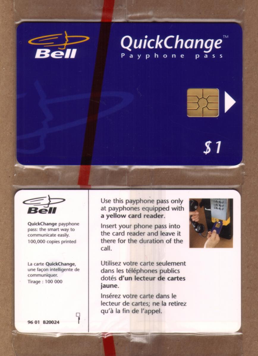 This Bell QuickChange card is sealed and originates from Canada. The card is a stored value chip card, also known as an SVC (stored value card), designed for quick change functionality. The design and labeling align with collectible chip cards issued in the mid-1990s, making it a notable piece for collectors interested in telecommunications or smart card memorabilia from that period.