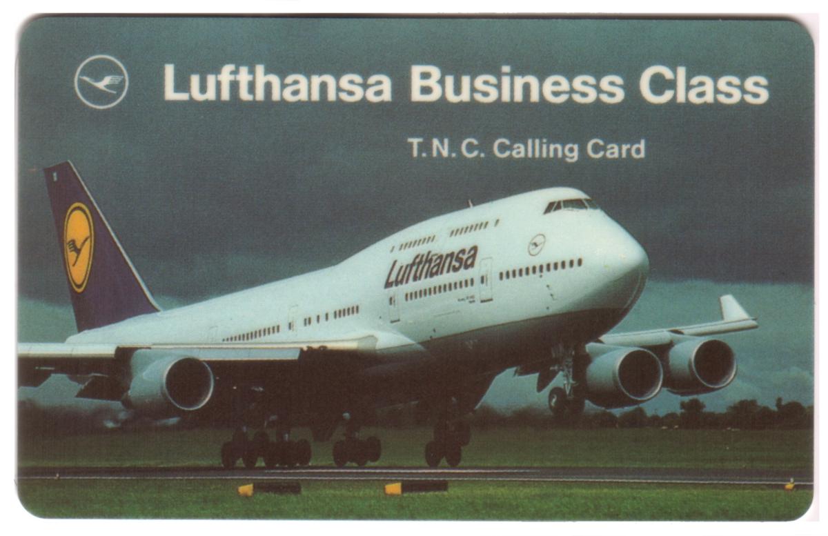 This collectible card features an image of a Boeing 747 airplane in flight, associated with Lufthansa Business Class and Telenational Communications (TNC) calling service. The airplane is depicted against a backdrop of clear blue sky, emphasizing its sleek design and the distinctive Lufthansa branding on the tail fin. The card prominently displays the Lufthansa logo and the text “Business Class” alongside the phrase “TNC Calling Card,” linking it to telecommunications services provided during international travel.