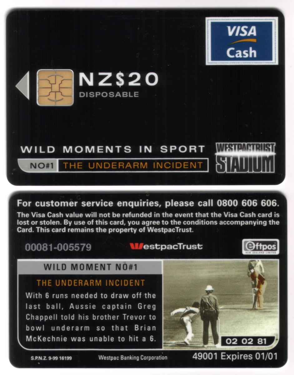 The front of the card showcases an action scene from the underarm bowling event, with a cricket player prominently depicted in mid-motion. The player is wearing traditional cricket whites, and the image captures the intensity of the moment. The card also includes text naming Westpac Trust and references to Visa Cash, emphasizing its use as a stored value Bank Card rather than a phone card.