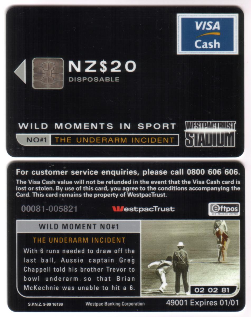 This collectible stored value card is a Westpac Bank Visa Cash Card from New Zealand, issued in 1999 as part of the "Wild Moments In Sport" series. The card’s design features a photographic image related to a notable sports incident known as "the underarm incident." The image shows a cricket player dressed in the traditional white uniform and helmet, positioned on a cricket pitch during a daytime match. The Westpac Trust logo appears prominently alongside Visa Cash branding, reinforcing the card’s financial and banking function.