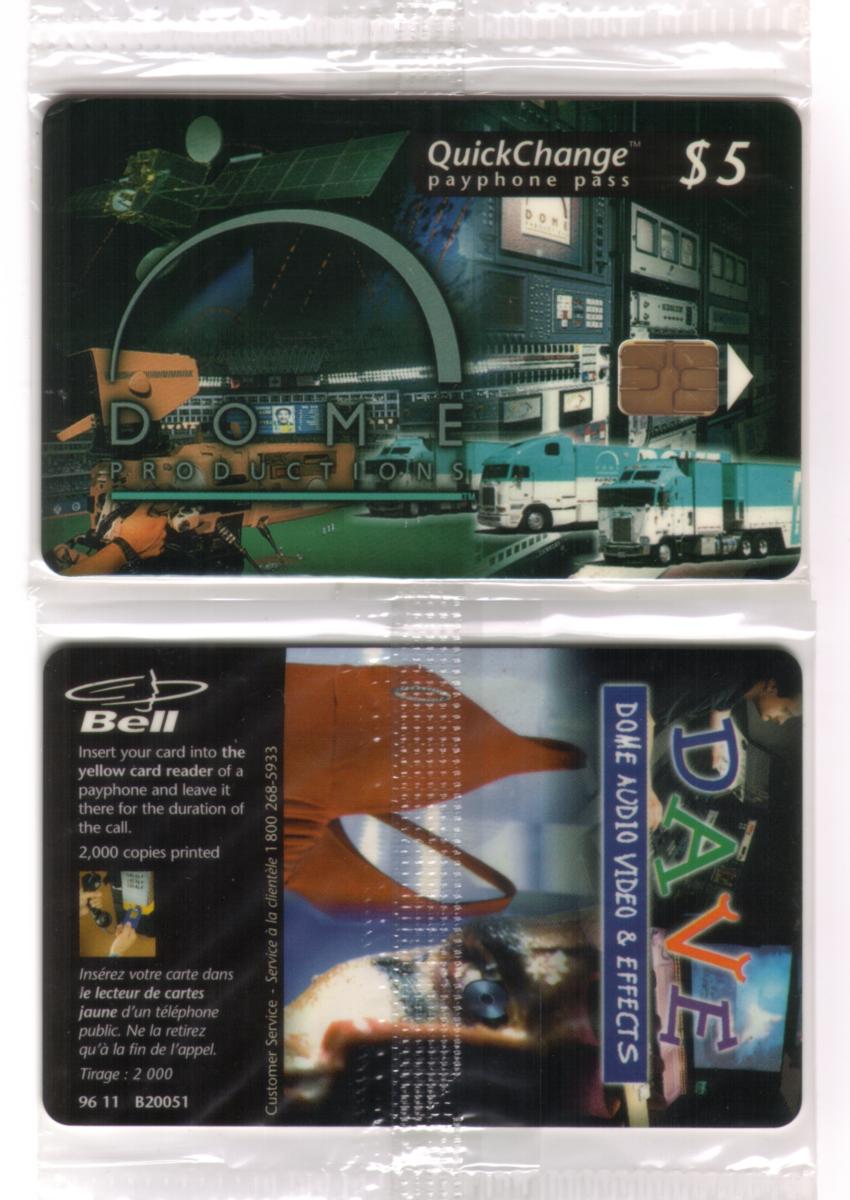 This collectible chip card is a stored value smart card with a face value of $5. It is produced by Dome Productions and branded with Dave Dome Audio Video & Effects. The card is sealed and originates from Canada. The front of the card prominently features the Bell QuickChange logo, indicating its association with Bell’s quick change phone card system.