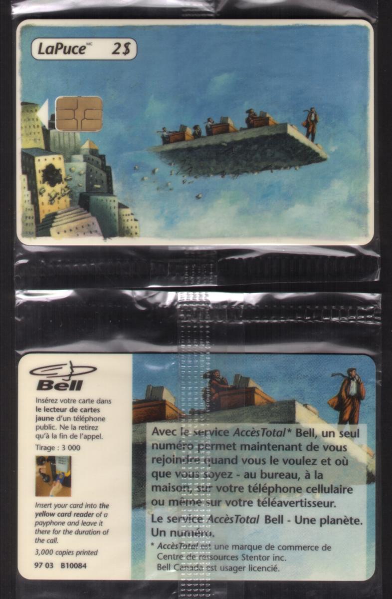 This is a collectible Canadian chip card associated with Bell’s telecommunication services, sealed in original condition. It is a stored value card granting access to services valued at two Canadian dollars. The card’s layout combines corporate branding and functional information related to Bell and Access Total service offerings.