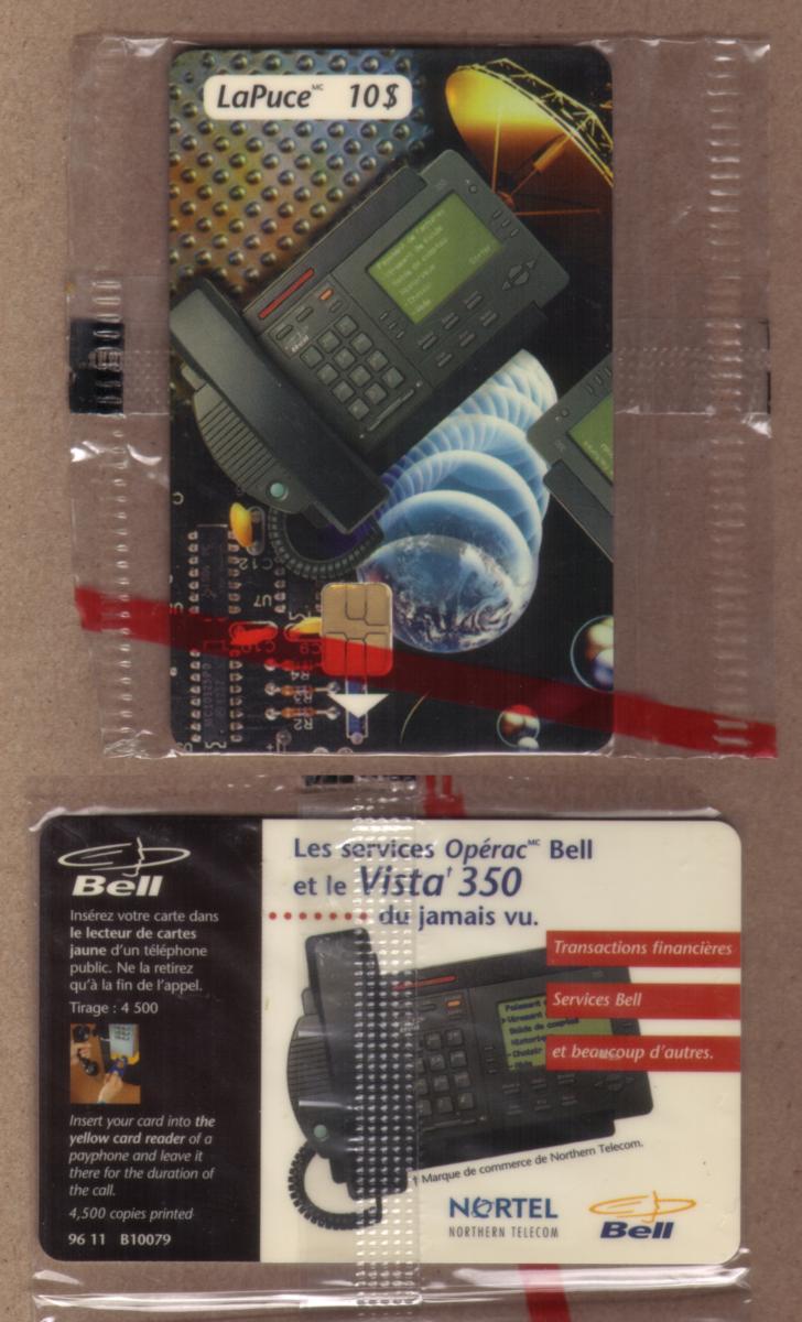 Additionally, the card incorporates elements related to phone service value cards, a category used for telephone-related transactions. The printed text includes multiple languages, with “LaPuce” in French, supporting its Canadian origin. The card’s presentation is precisely designed to represent a Canadian phone card authorized by Bell, featuring a smart chip for secure interaction.