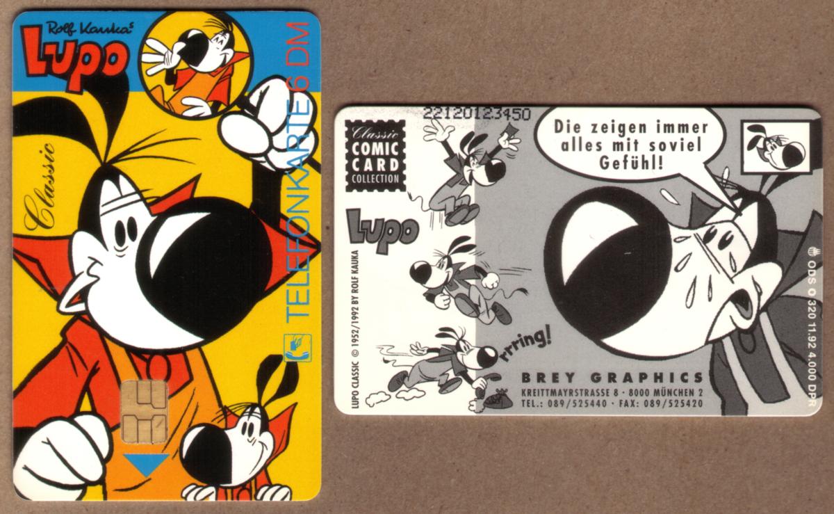 The card is identified as a service card ("svc") and incorporates an embedded chip, signifying it as a chip card used in Germany. The design emphasizes the comic theme linked to the character Lupo, serving as a collectible within the classic comic card series. The overall appearance is bright and playful, appealing to collectors who appreciate comic art alongside chip card technology.