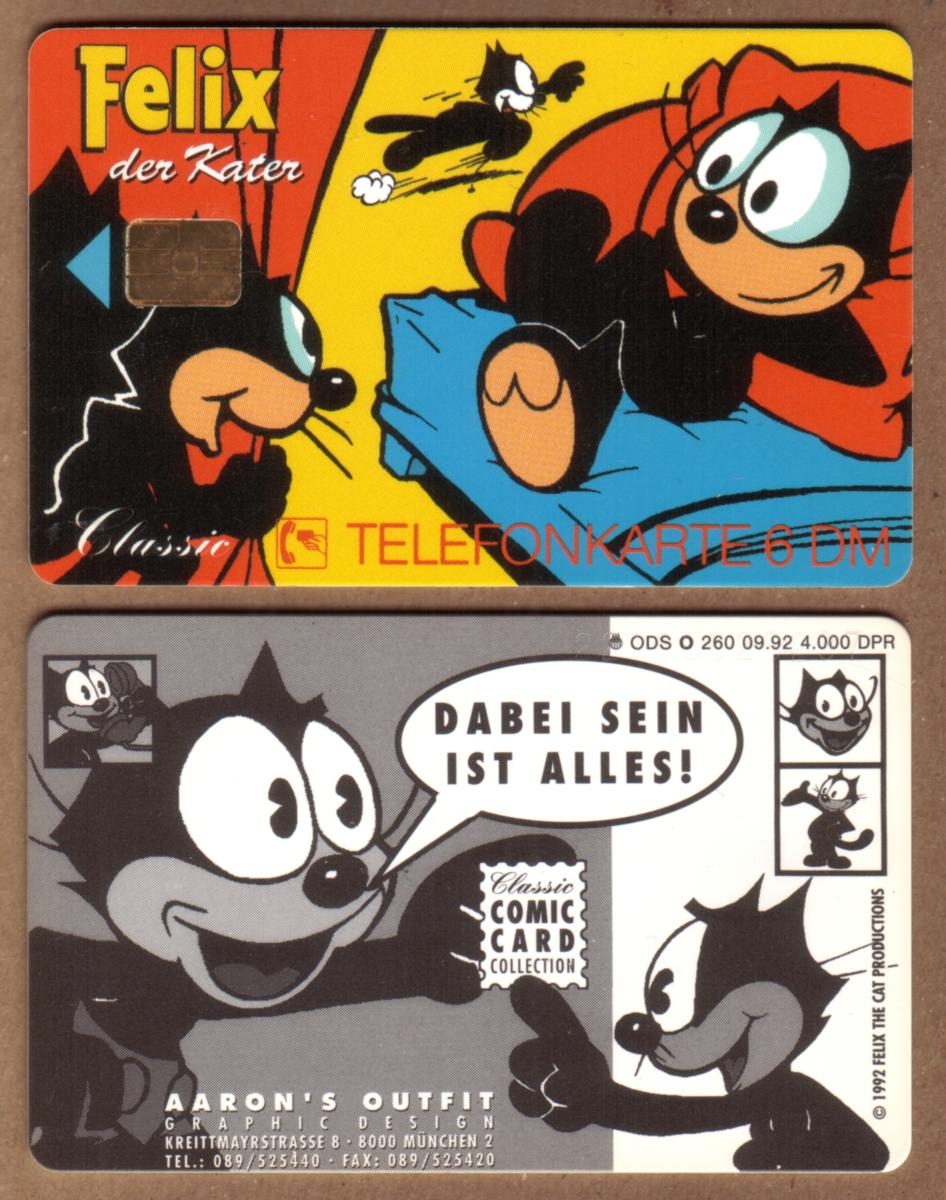This collectible chip card features Felix the Cat, the iconic animated character from the classic comic collection. The card prominently displays a vibrant, full-color illustration of Felix in a playful pose, with his wide eyes and mischievous grin clearly visible. Felix is shown in his traditional black-and-white color scheme, set against a yellow background that enhances the character’s visibility and charm.