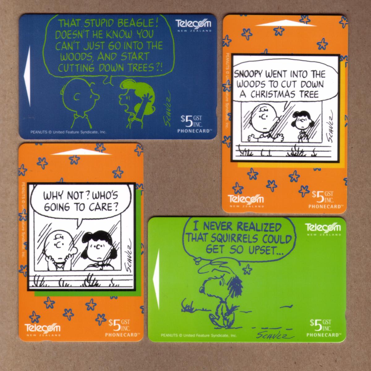 This collectible phone card from New Zealand features characters from the Peanuts series, specifically Charlie Brown, Lucy, and Snoopy. The design includes four separate images arranged together, depicting these beloved characters in different poses and scenes. Charlie Brown is easily identifiable by his characteristic yellow shirt with the black zigzag pattern. Lucy appears with her classic blue dress, and Snoopy is shown as the iconic beagle dog from the Peanuts comic strip.