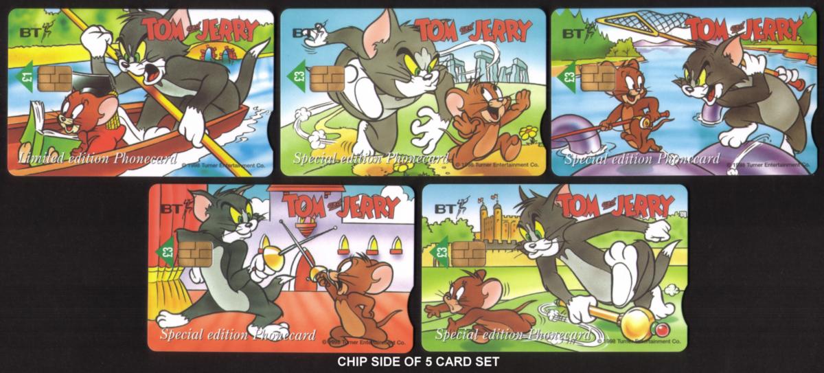 The card prominently displays the BT logo, indicating its association with British Telecommunications. The design incorporates bright blue elements and gold accents, blending vibrant colors that complement the animated figures of Tom and Jerry. The card is a chip card, designed for entertainment and collectible purposes, reflecting a collaboration that ties popular animation to notable British culture and locations.