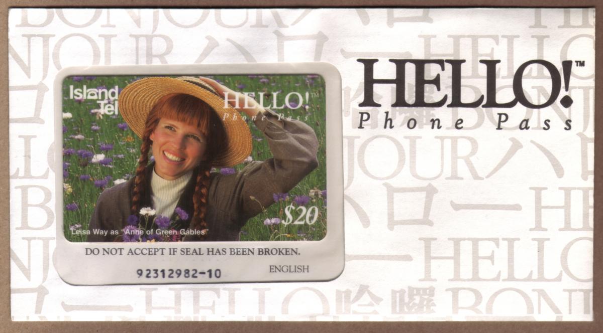 The card has text in English, including the word "Hello!" prominently displayed near Anne. The name "Leisa Way" appears at the bottom, along with the denomination "$20." The card is marked as sealed and issued by Island Tel, a telecommunications company in Canada. The design and text placement emphasize the connection to the Canadian cultural icon of Anne of Green Gables.