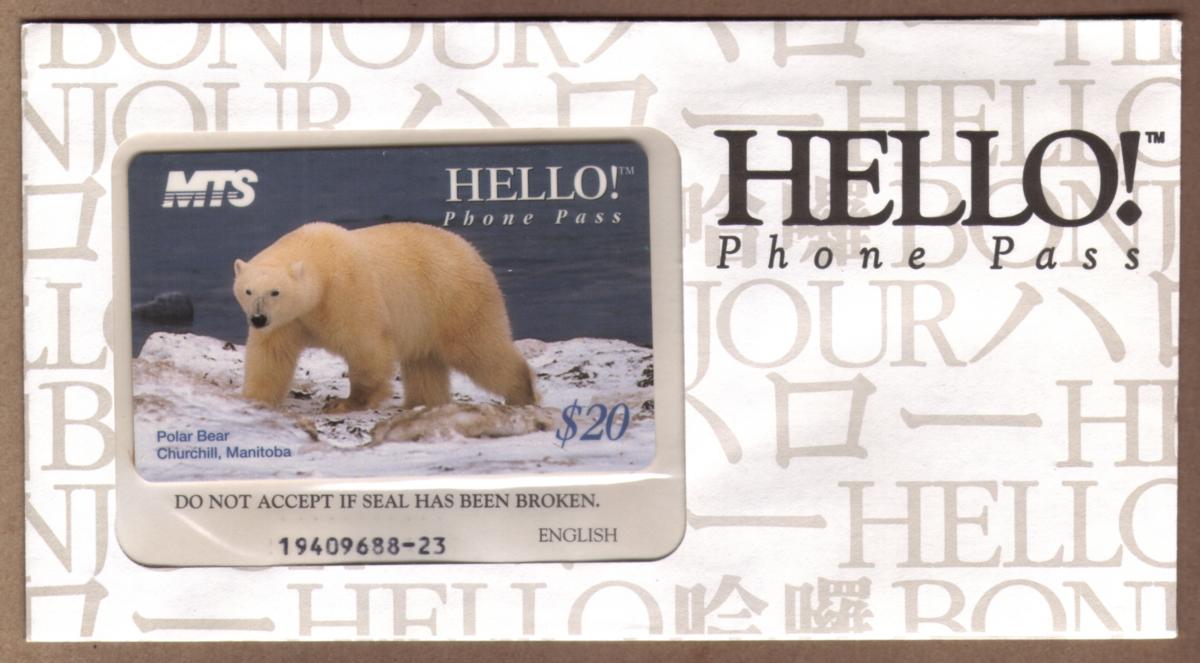 This collectible phone card features a detailed image of a polar bear walking through snow, set against a wintry landscape. The scene is identified as Churchill, Manitoba, a location in Canada known for its polar bear population. The polar bear is positioned prominently within the snowy terrain, emphasizing its natural habitat during winter.