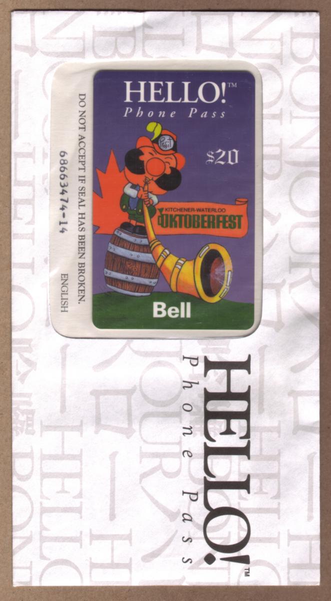 This collectible phone card features artwork related to Oktoberfest in Kitchener-Waterloo, Canada, dated October 1994. The card’s design includes the text “$20 Oktoberfest Kitchener Waterloo (October 1994)” prominently displayed in a clear and bold font. The name Bell Canada is also shown, indicating the card’s issuer.