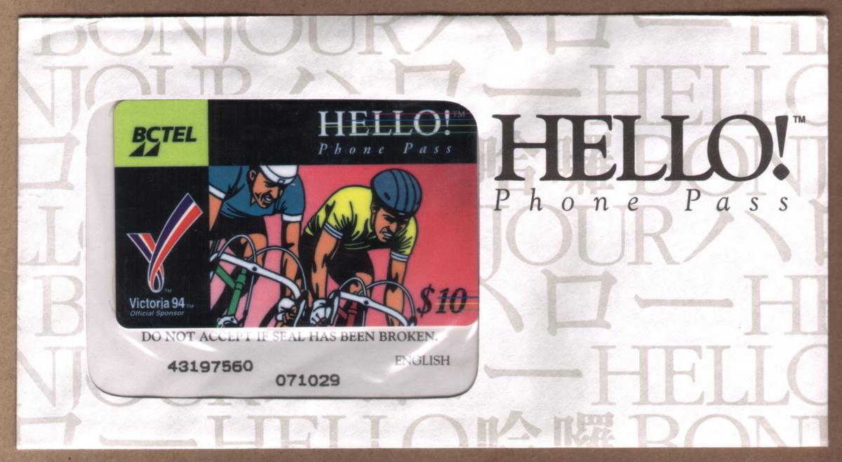 Overall, this phone card celebrates the cycling events of the 1994 Commonwealth Games held in Victoria, Canada. It is marked as sealed, preserving its collectible condition. The design combines both photographic realism and clear informational text to honor the athletic competition and the host city.