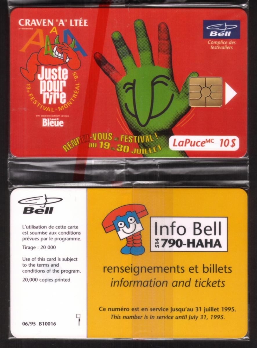 Overall, the card celebrates the 1995 Just For Laughs Festival in Canada, combining sponsorship and stored value technology used by Bell. It is sealed and maintained in collectible condition, making it a valuable item for collectors interested in Canadian festival memorabilia and phone card history.