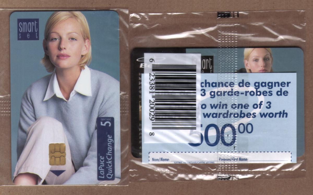 Additional text includes references to the card’s technology as "Quick Change" and "Smart Set," signaling its stored value features combined with enhanced electronic capabilities. The card's overall theme is centered on the woman’s portrait without further graphical or thematic elements. The presentation and details align with collectible chip cards issued in Canada.