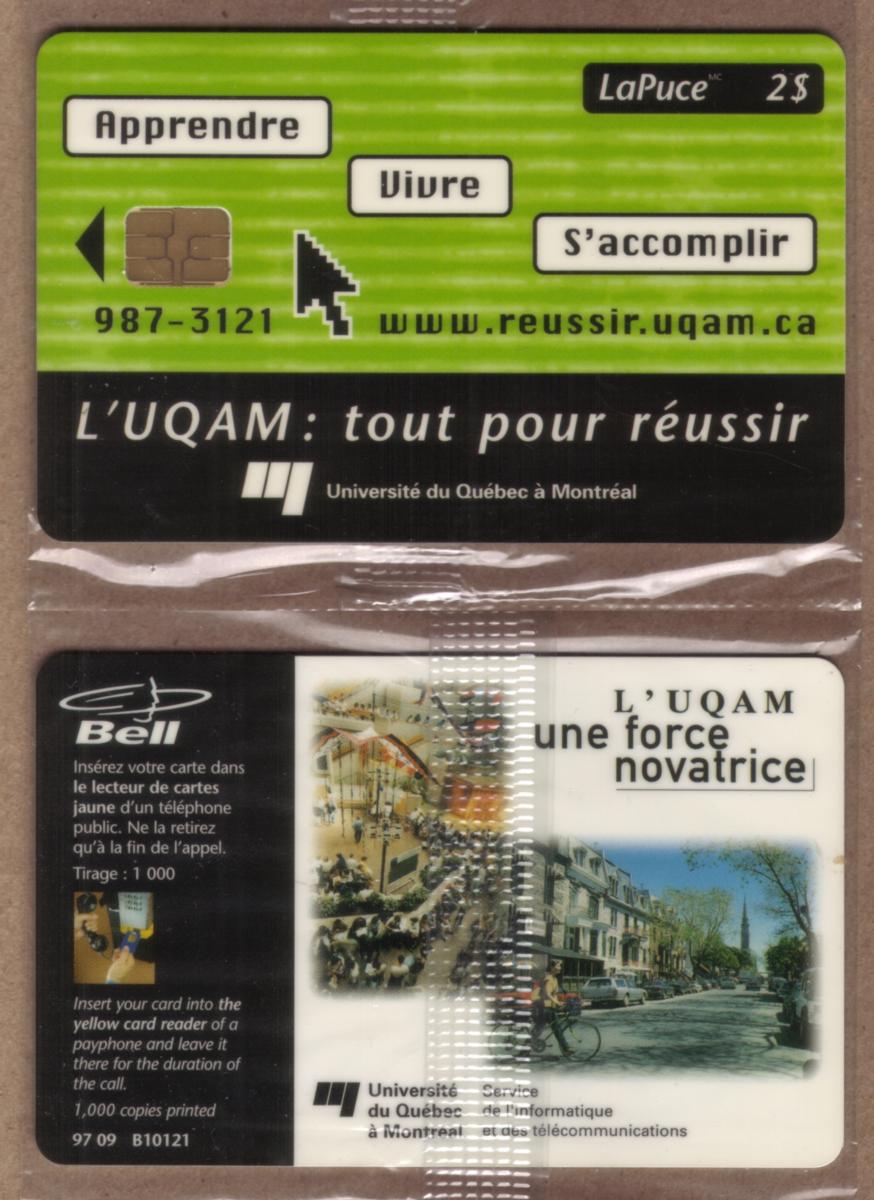 This collectible chip card is a stored value card issued in Canada by Bell under the LaPuce brand. The card features the logo and name of UQAM, which stands for the University of Quebec at Montreal. The card is associated with the slogan "Learn, Live, Achieve," emphasizing the university’s motto. The design predominantly uses blue tones with white text, and includes the phrases “An innovative force” and “Everything to succeed,” highlighting themes of education and progress.