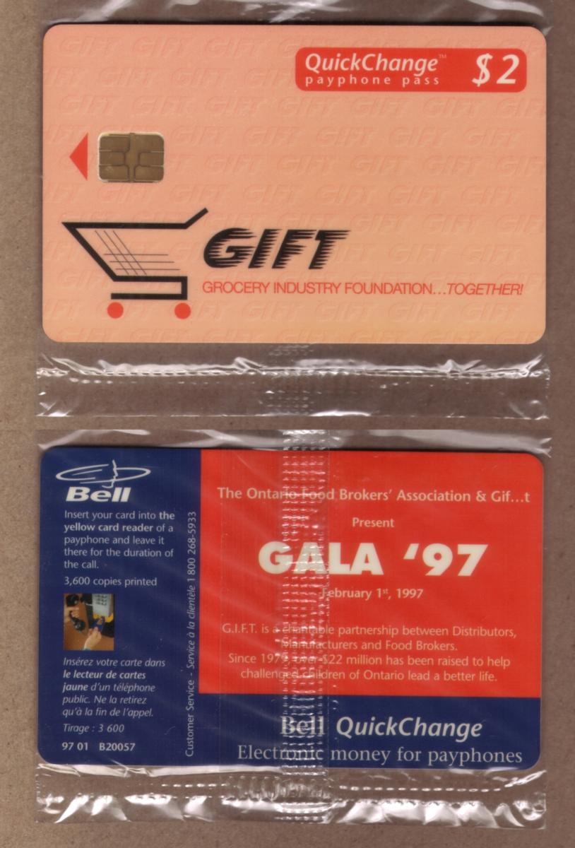 This card represents a collaboration between Canada Bell and the Grocery Industry Foundation Together for their 1997 Gala. The usage of the chip indicates its role as a smart card, primarily designed for transactions or services related to its promotional or fundraising purpose. The clean layout and specific event branding highlight its collectible nature within the Canadian phone card and stored value card market.