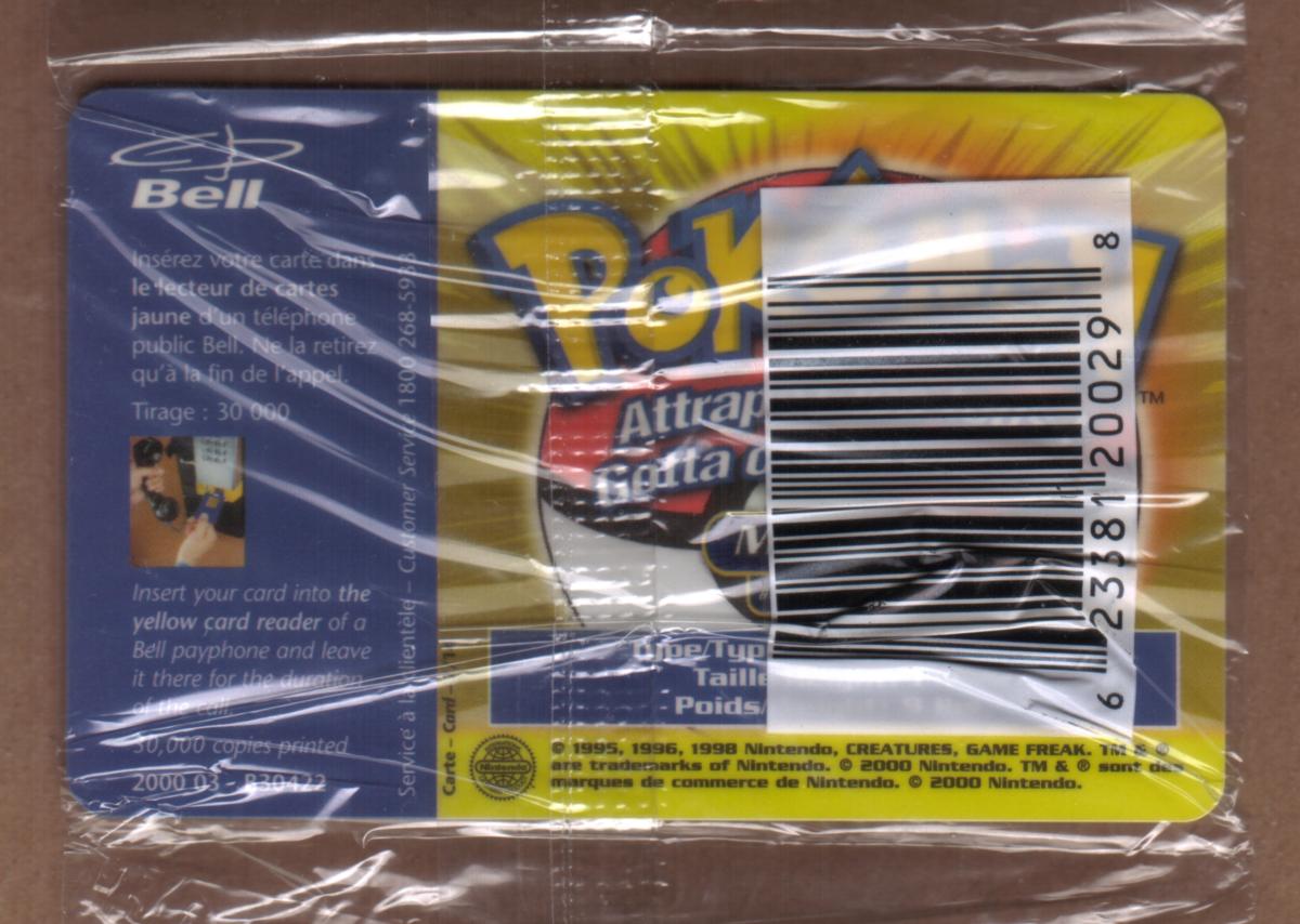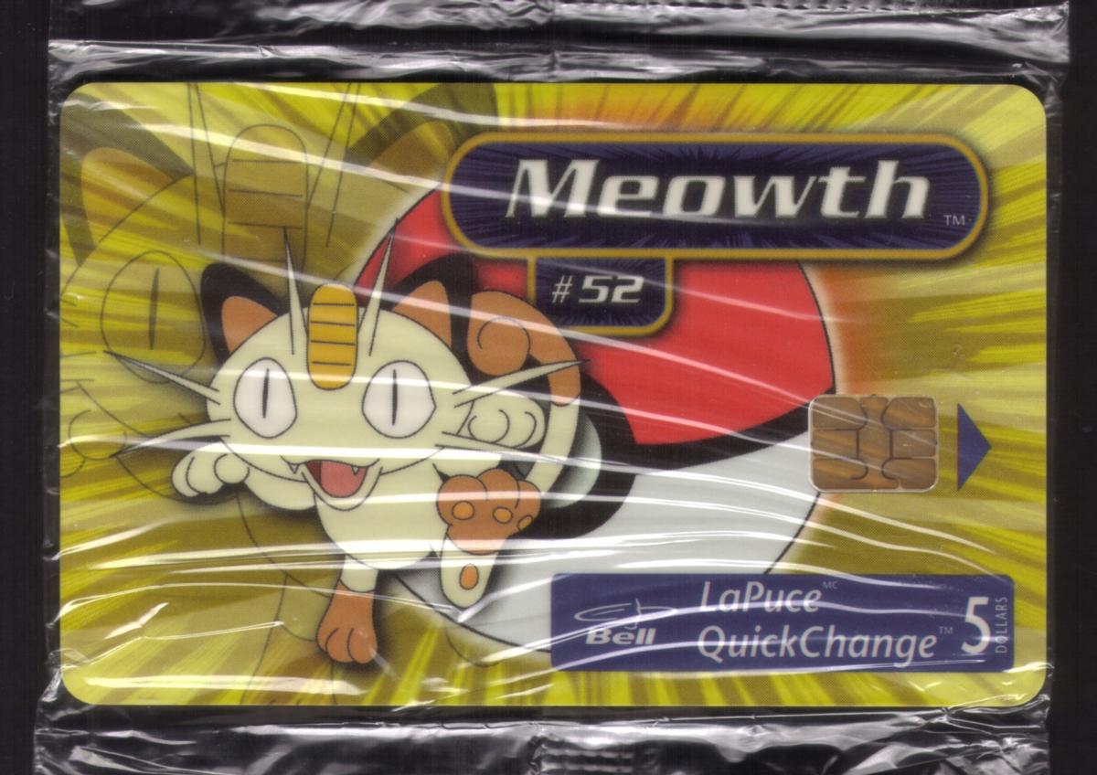 This chip card is sealed and originates from Canada. It is a collectible stored value phone card from the Pokémon series, specifically featuring Meowth in its original design. The card carries no other branding or graphics outside those described, making it a distinct piece for collectors interested in Pokémon or telecom branded memorabilia.
